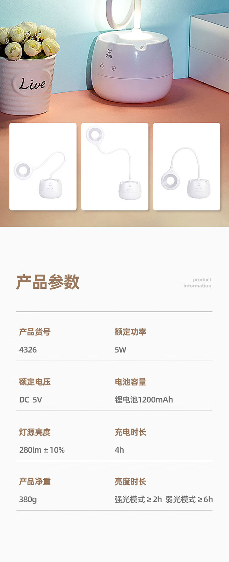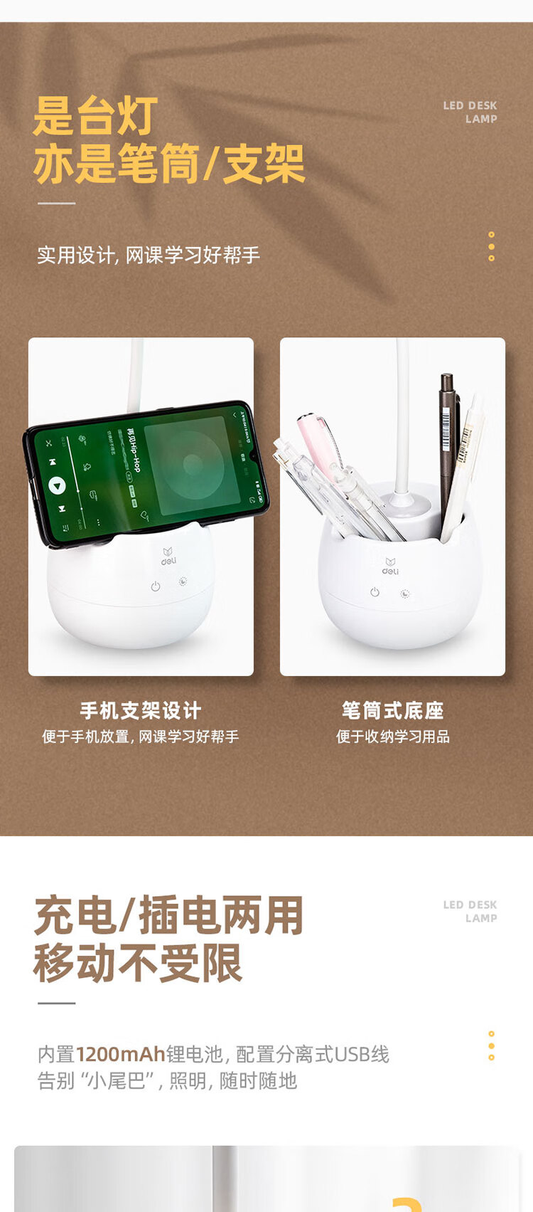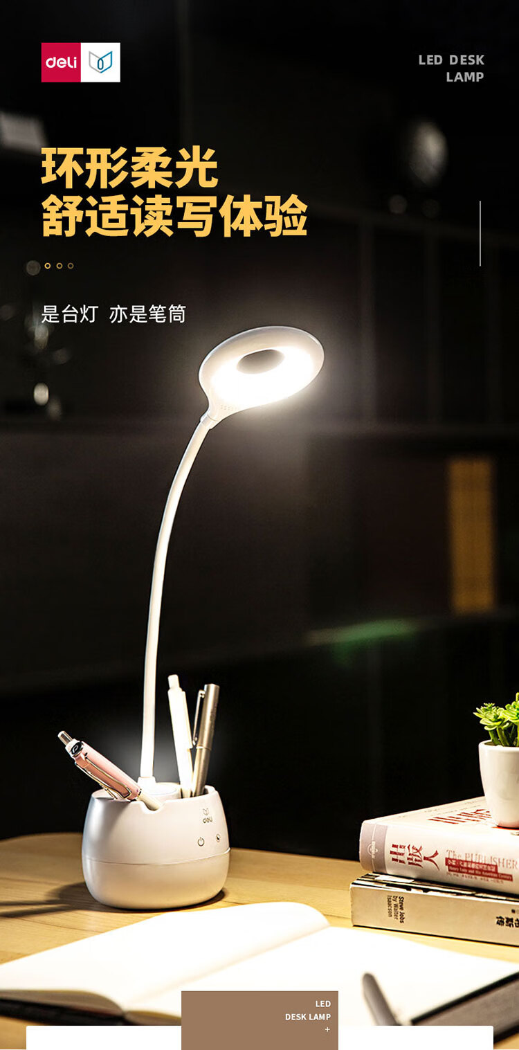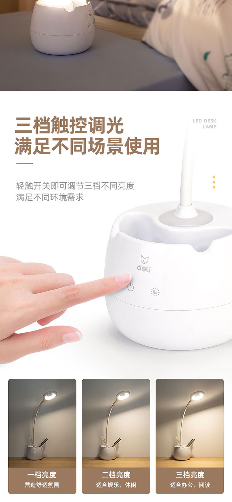 得力(deli)帶筆筒創(chuàng)意護(hù)眼臺(tái)燈 3檔調(diào)節(jié)可當(dāng)夜燈 白4326 自營