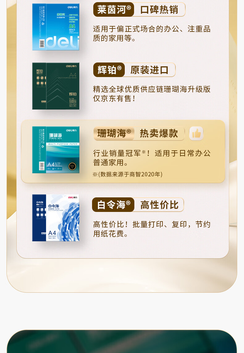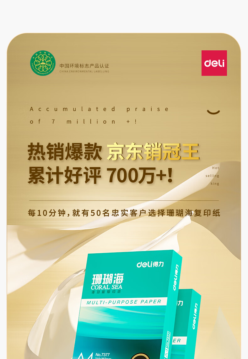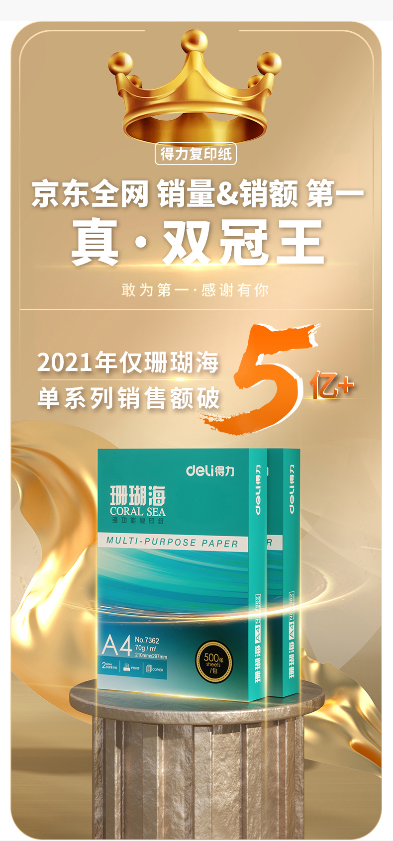 得力(deli)珊瑚海 A4 80g 加厚雙面打印紙 行業(yè)熱銷復(fù)印紙 500張/包 8包1箱(整箱4000張) 自營